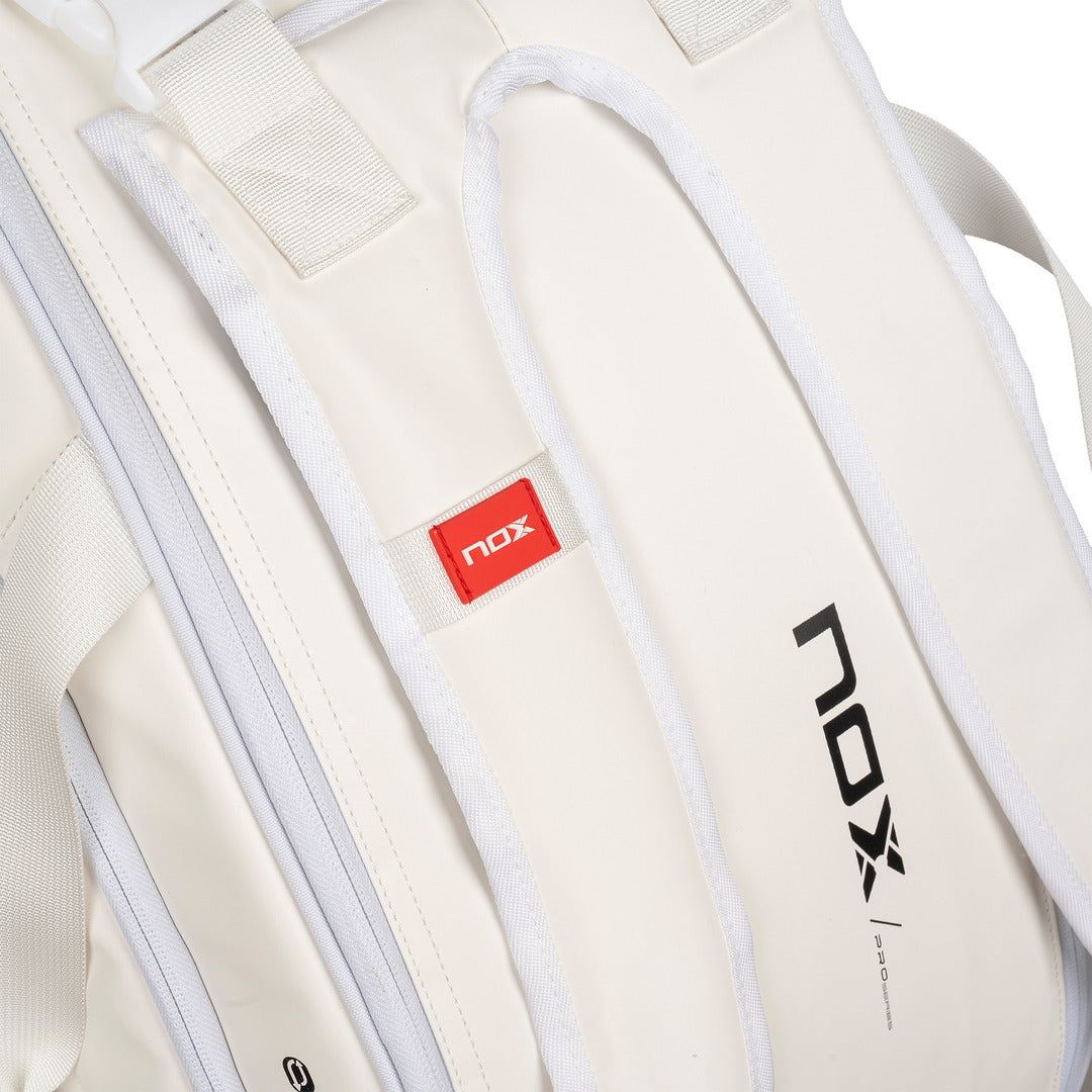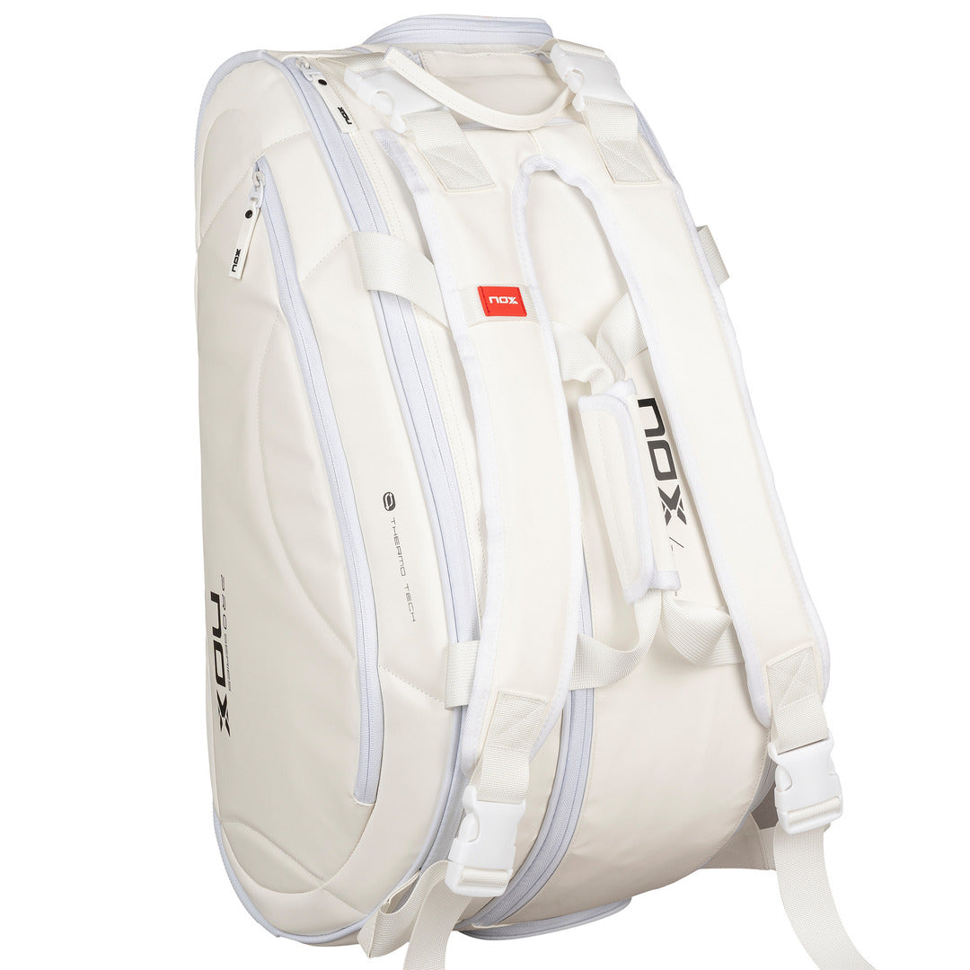 The Nox PRO Series White Bag combines high-capacity storage, thermal protection, and ergonomic design—perfect for elite padel players.